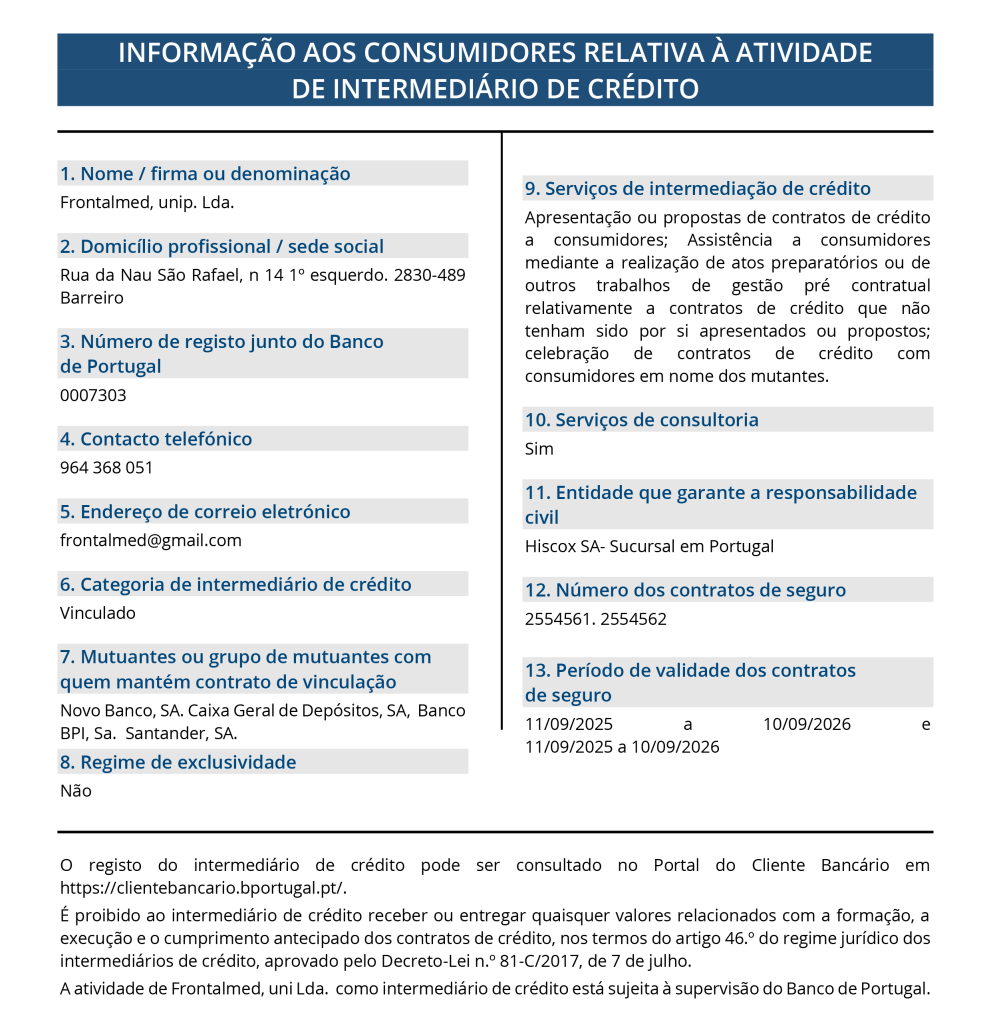 Somos um intermediário de crédito, vinculado e autorizado pelo Banco de Portugal, que actua em todo o território nacional, com uma equipa especializada em crédito sempre disponíveis.